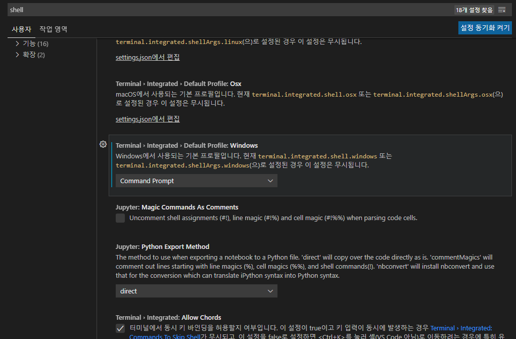 키워드는 shell이라는 걸 생각하고 setting에 냅다 shell을 치고 관련된 모든 옵션들을 읽어봤다